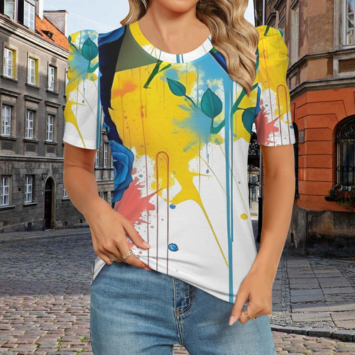 Rich and Rich Rose Paint Women's Puff Sleeve Tshirt Women's Round Neck Puff Sleeve T-Shirt