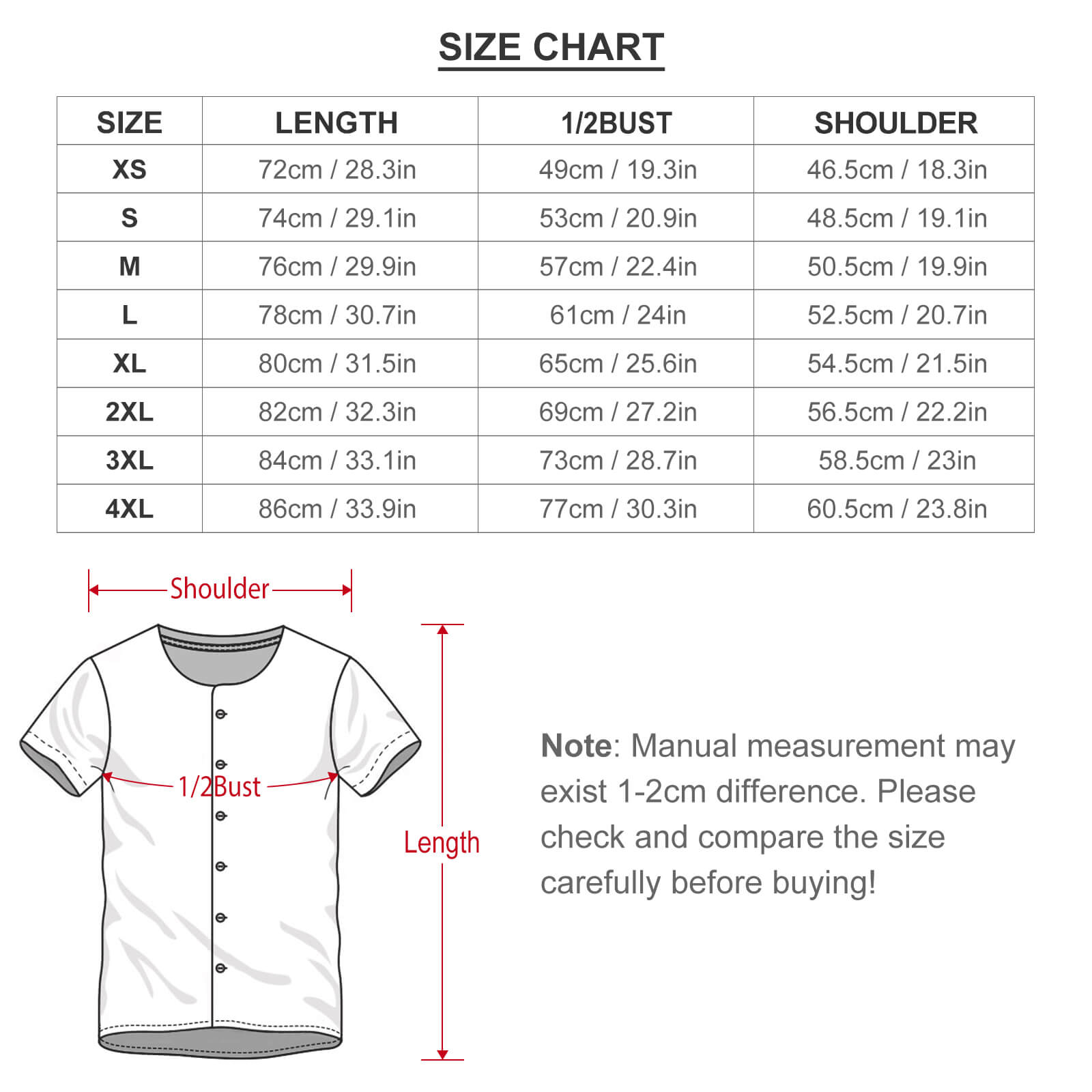 • Sizes: XS, S, M, L, XL, 2XL, 3XL, 4XL. Calculate your size from the measurement chart below please.