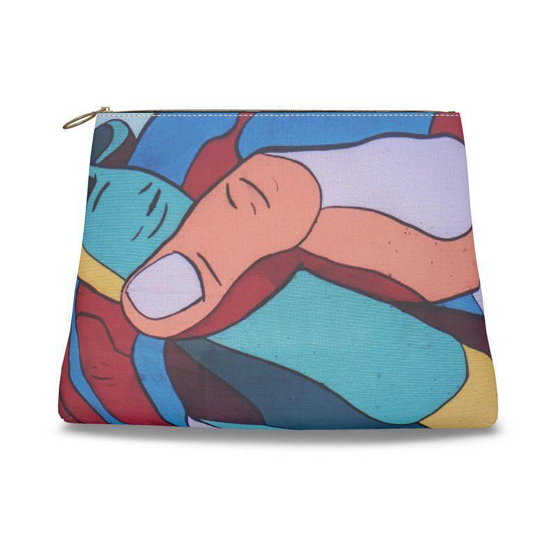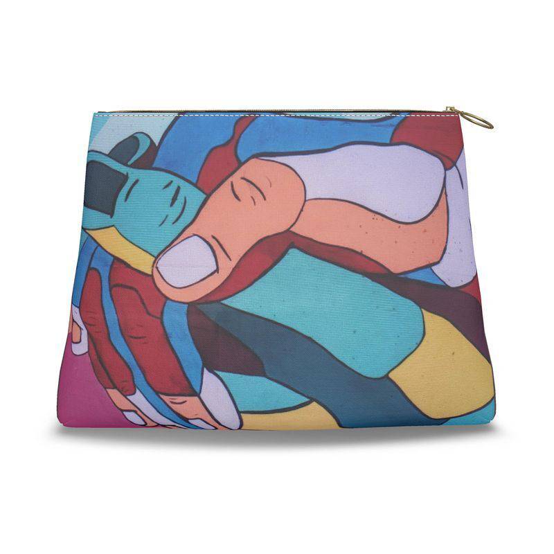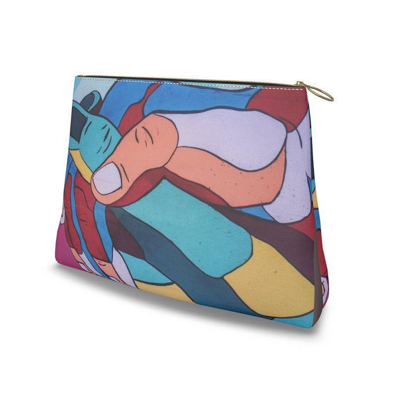 Multi-color clutch featuring joining hands of piece.