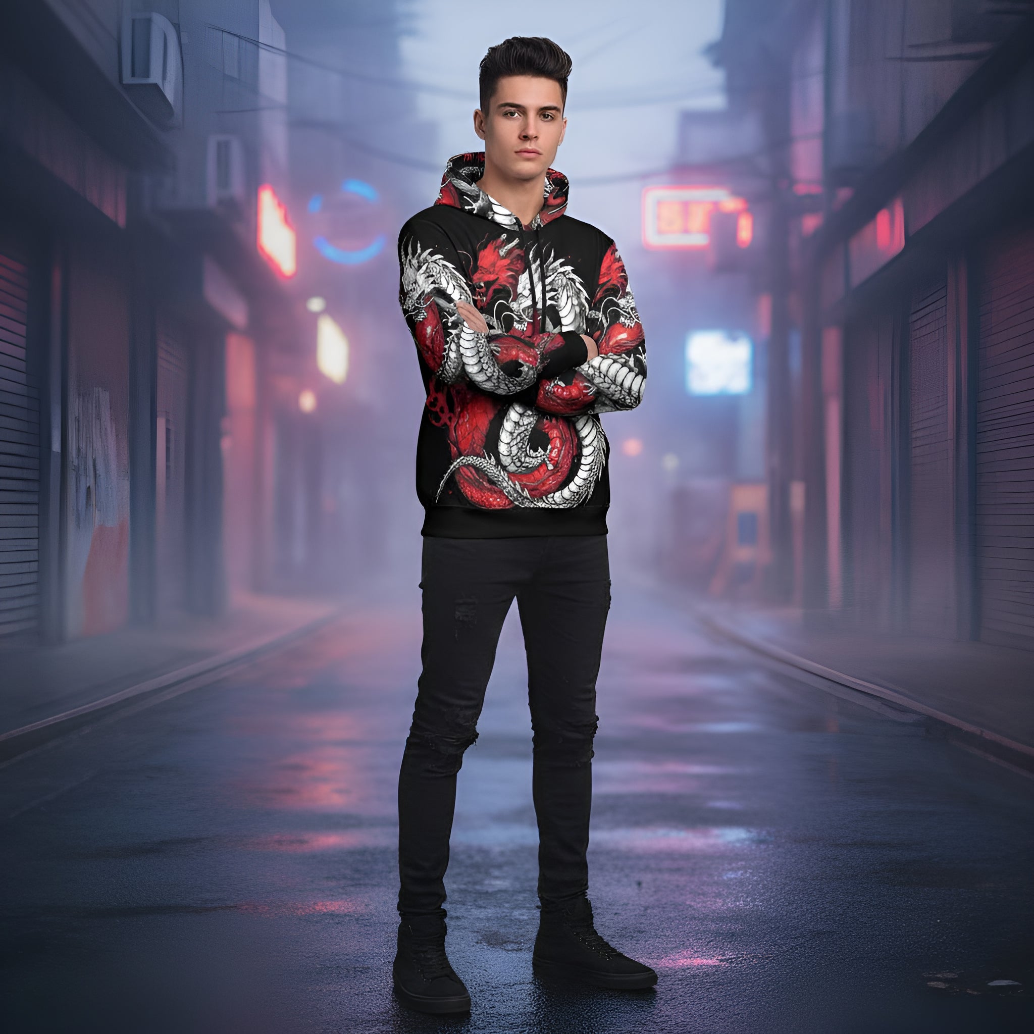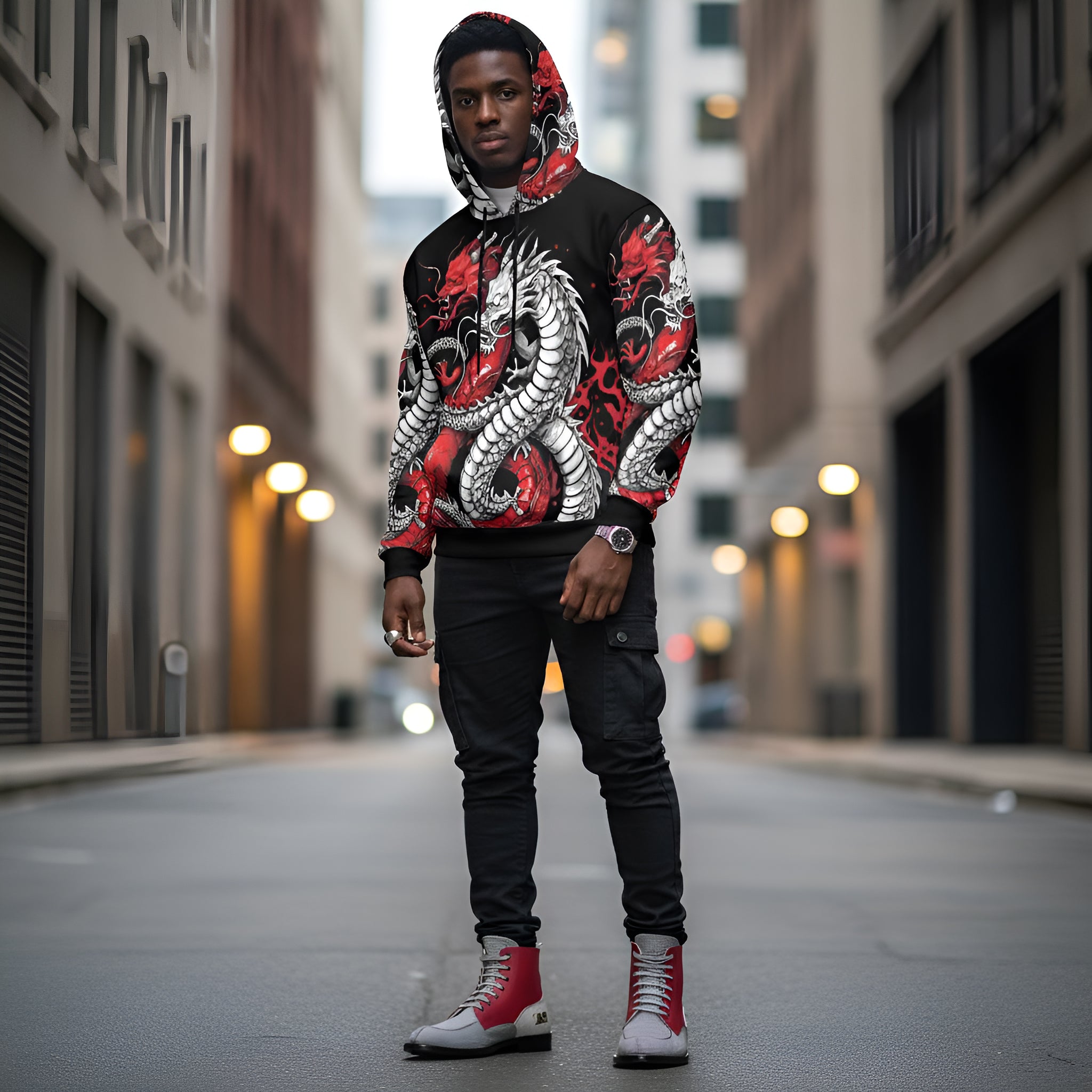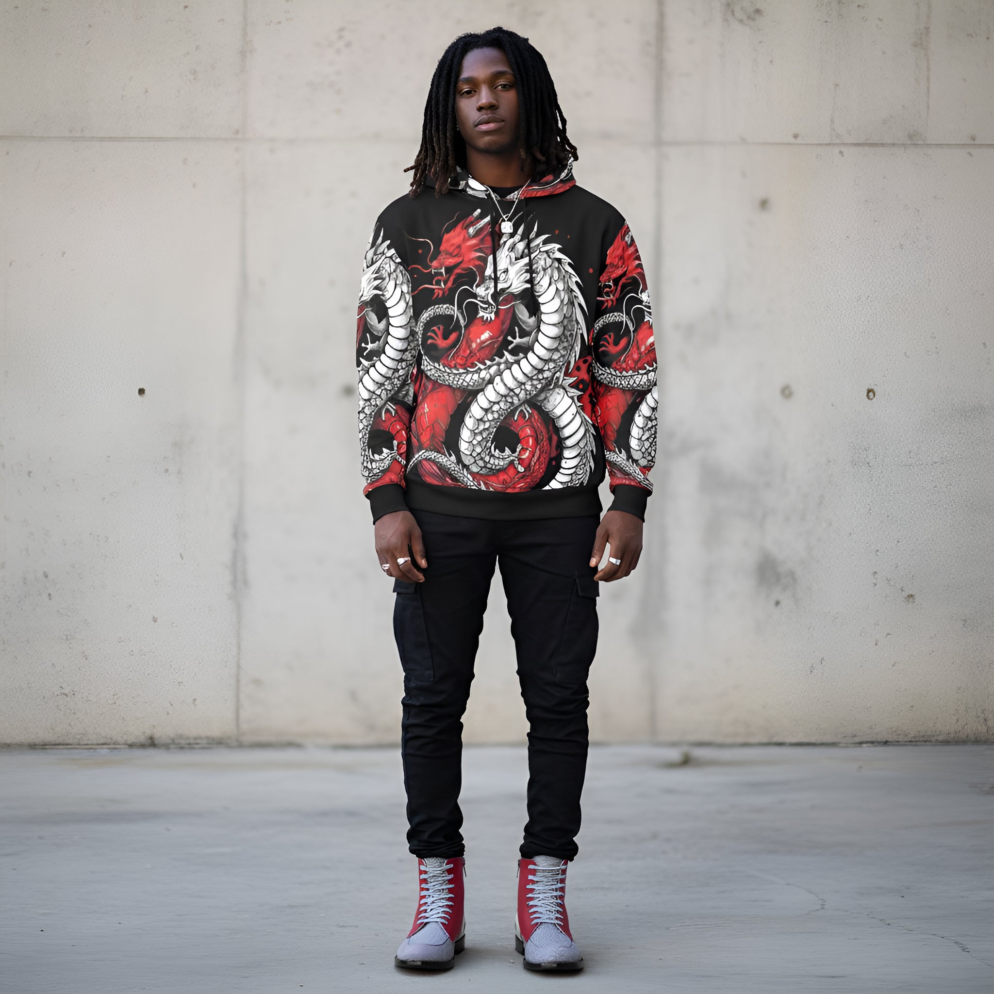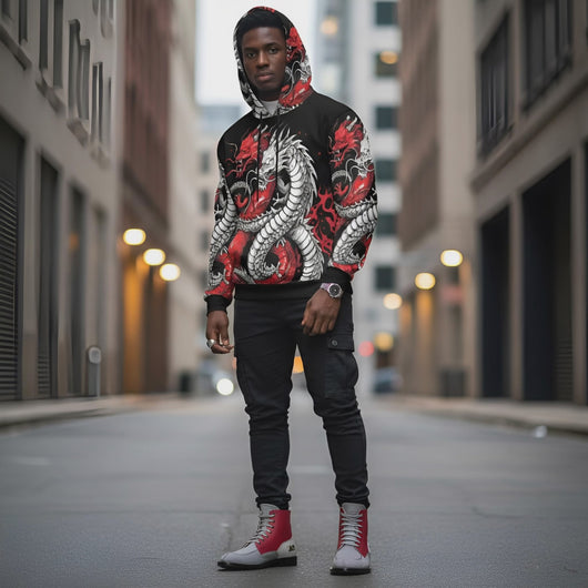 Step into a realm of bold style with the Rich and Rich Black and Red Snake Men's Hoodie, where comfort meets haute couture. Tailored for the discerning gentleman, this hoodie is woven from a luxurious blend of 95% polyester and 5% spandex, ensuring an incredibly soft touch that drapes effortlessly over your form. A perfect fusion of fashion and function, it boasts a classic cut that’s designed to complement, not confine.