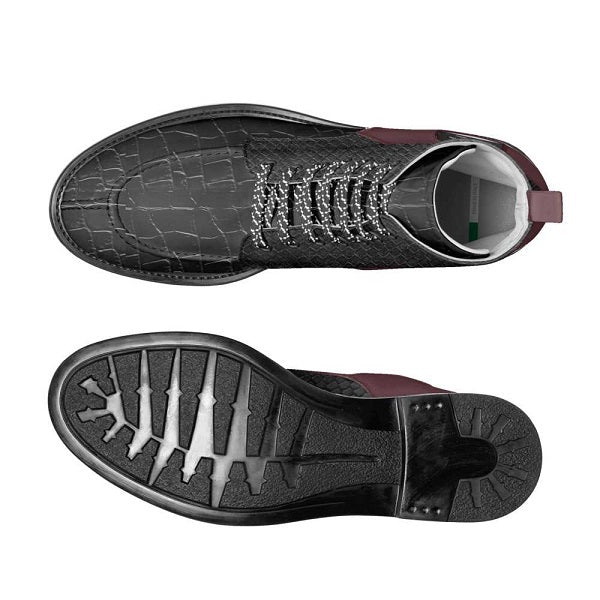 This ankle boot is crafted from embossed materials panels, featuring a biker-inspired silhouette with a lace-up front and black rubber sole. A padded heel counter and heel loop ensure comfort and easy wear, with a logo window for brand recognition.